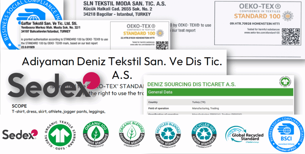 GOTS, OCS, GRS ve RCS sertifikaları alma ve gerekliliklerini yapmak, OEkotex-Std 100 sertifikası almak ve gerekliliklerini yapmak, SEDEX ve BSCI sertifikalarını almak ve gerekliliklerini yapmak. Organik, Geri Dönüşüm, BCI ya da CMIA ham madde kullanmak, kullandığımız ham madde sertifika ya da raporları müşterilerimize vermek, kurumsallık adına yapılmış başka bir ciddi iş olacaktır. Kağit üzerinde değil; gercekten bu ruhu taşimak istiyorsaniz, bizi arayin.