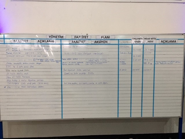 Toplantı esnasında alınması kararlaştırılan aksiyonlar mutlaka aksiyon listesine sorumlu ve hedef çözüm tarihi bazında yazılmalı ve her gün toplantı sonunda mutlaka günü gelen aksiyonların sonuçları sorgulanmalıdır.