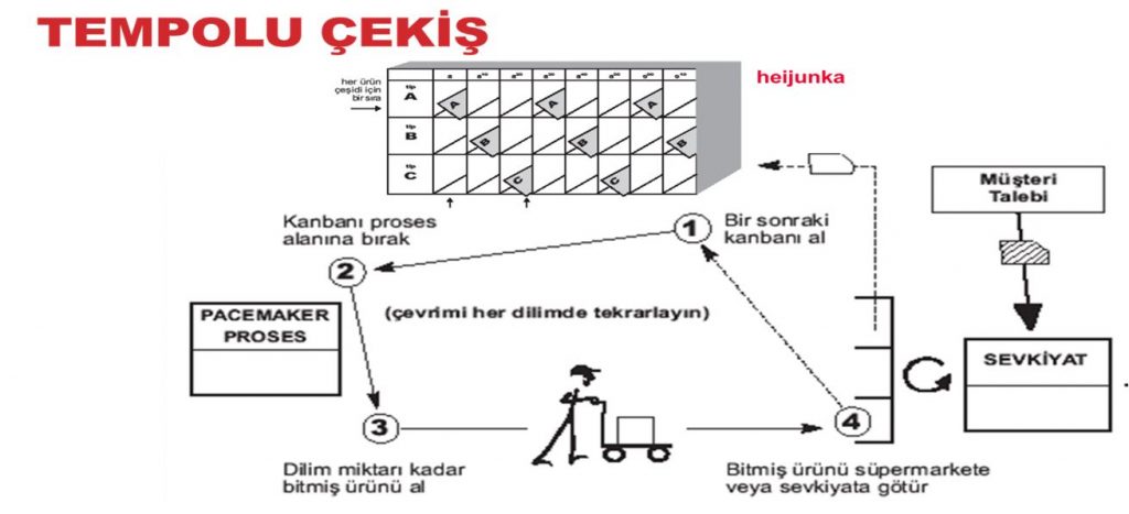 Aşağıda tam bir Heijunka çalışmasını şematik örneğini görüyorsunuz. Müşteri çekişine göre hazırlanan Heijunka kanban kartları kutuya yerleştiriliyor. Bantlar buradaki adet ve sıraya göre üretimi yapıyor.
